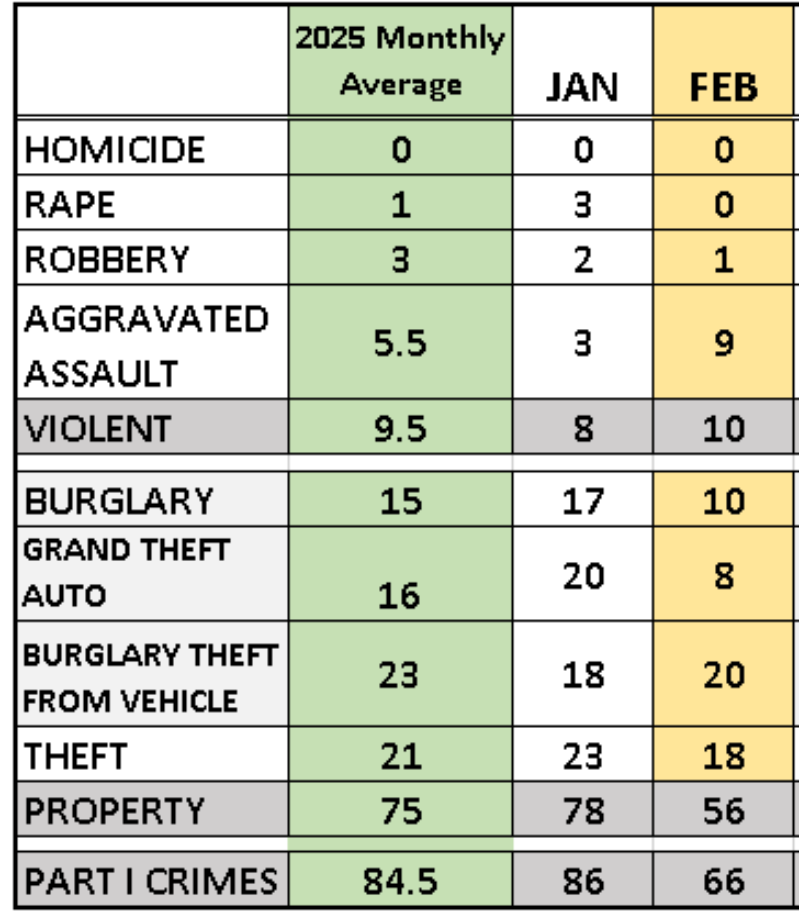 As the first three months of 2025 averaged 95-105 crimes per month in the Mar Vista Community Council (MVCC) area, the last five months of 2025 had 71-79 crimes per month, a noticeable decrease in crimes.