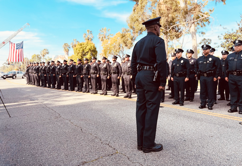 LAPD Pacific Division officers stand at attention during the formal inspection ceremony marking the 100th anniversary of Pacific Area, February 2025.