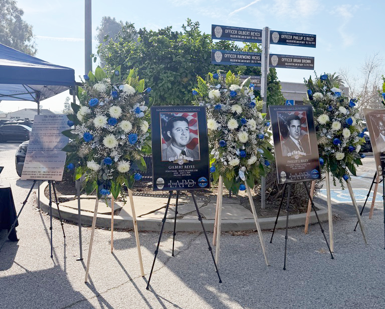 Floral tributes honor fallen Officers Gilbert Reyes and Phillip S. Riley among the 239 LAPD officers lost in the line of duty, remembered during Pacific Division's centennial celebration, February 2025.