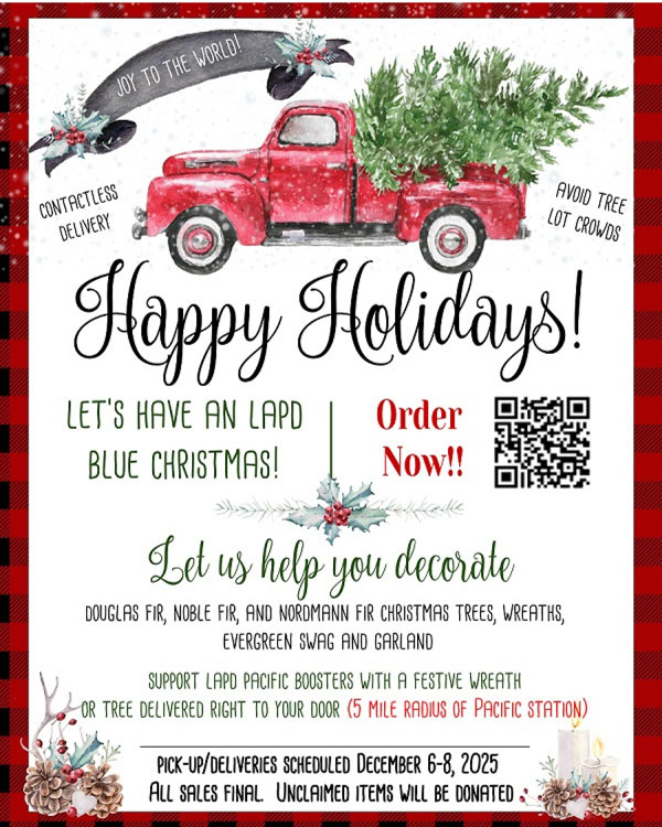 Support LAPD Pacific Boosters with a Festive Wreath or Tree Delivered right to your door!
