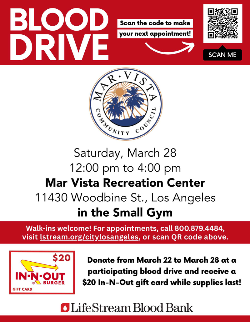 Mar Vista Community Council will be hosting a blood drive at the Mar Vista Rec Spring Festival. - SATURDAY, MARCH 28th