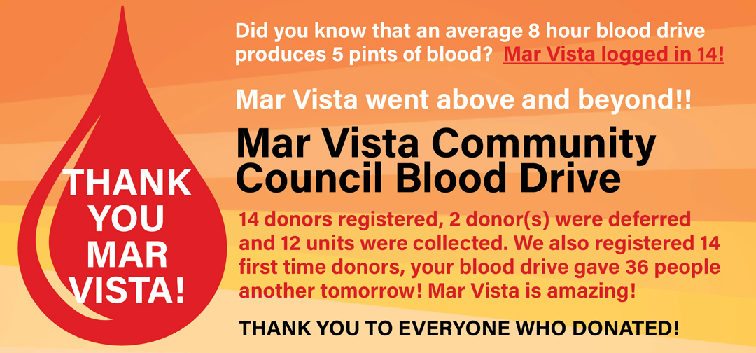 Mar Vista Community Council had a booth at the Mar Vista Rec Fall Festival, and we sponsored a blood drive through Lifestream Blood. It was a beautiful Saturday filled with kids and families. The blood drive produced good numbers. MVCC gave safety vests that were the fashion statement of the day, rice krispy treats, chips ahoy, animal crackers, and goodie bags for kids that included play doh, a fun lighted ring, and bubbles!