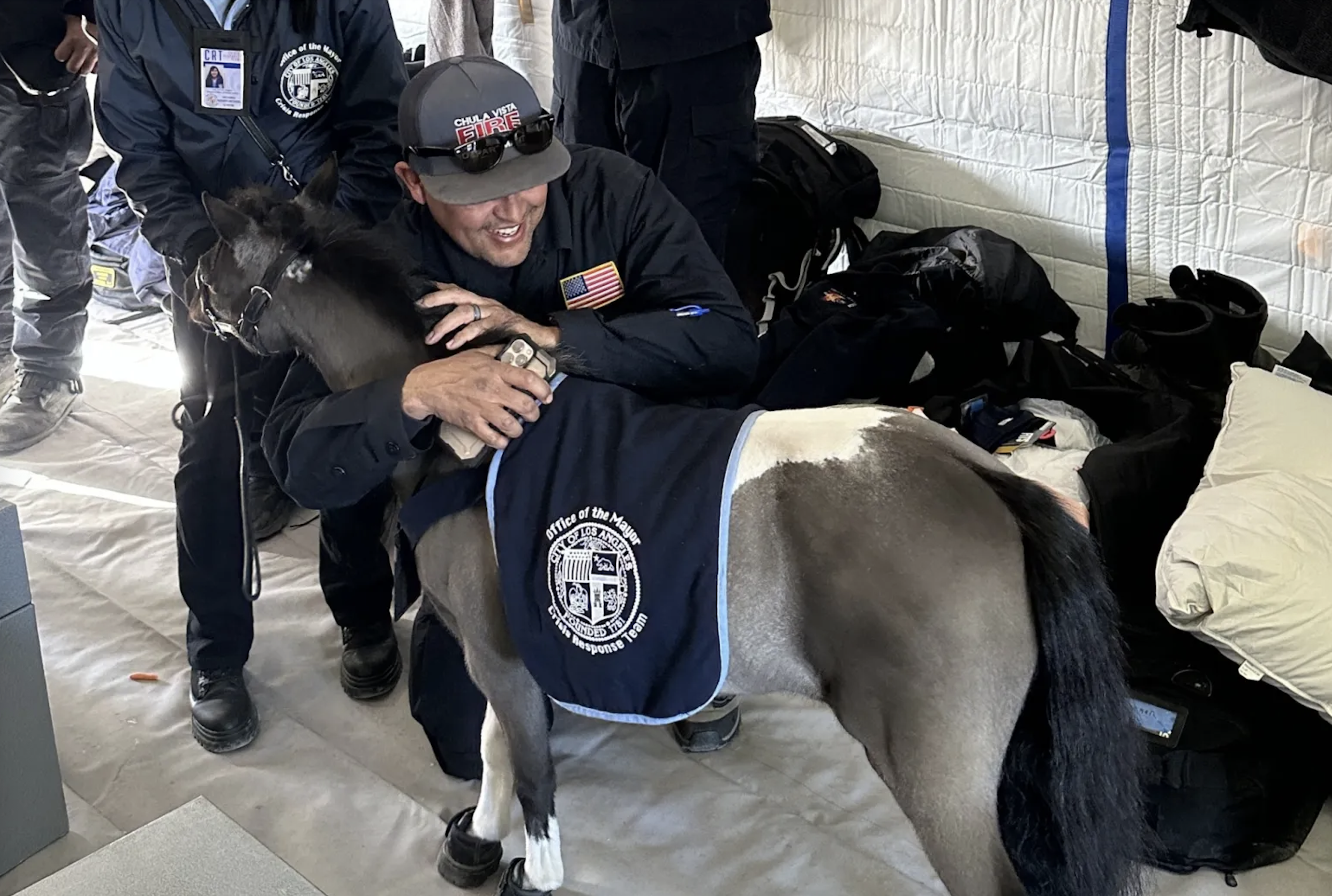 A first-responder hugs a mini therapy horse as the horses offered comfort for fireighters during the Palisades fire. (Courtesy of Mini Therapy Horses)